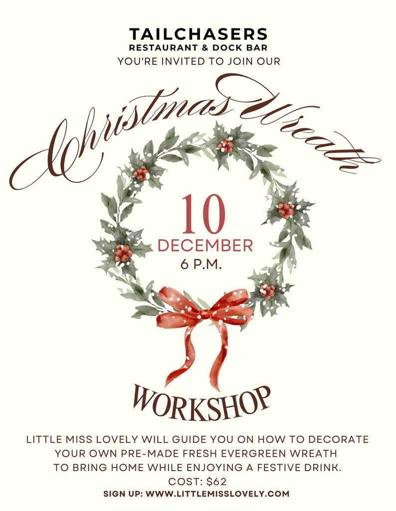 Tailchasers Restaurant & Dock Bar will be transformed into a wreath-decorating studio for the event. The restaurant & bar will have dining and drink options available for purchase during the workshop.